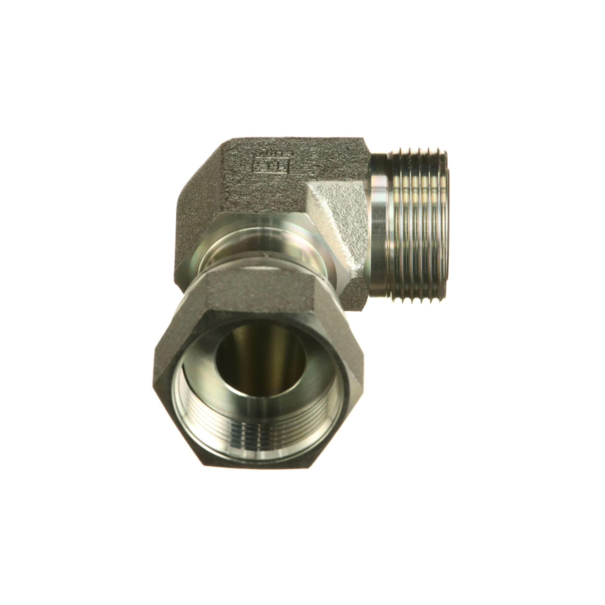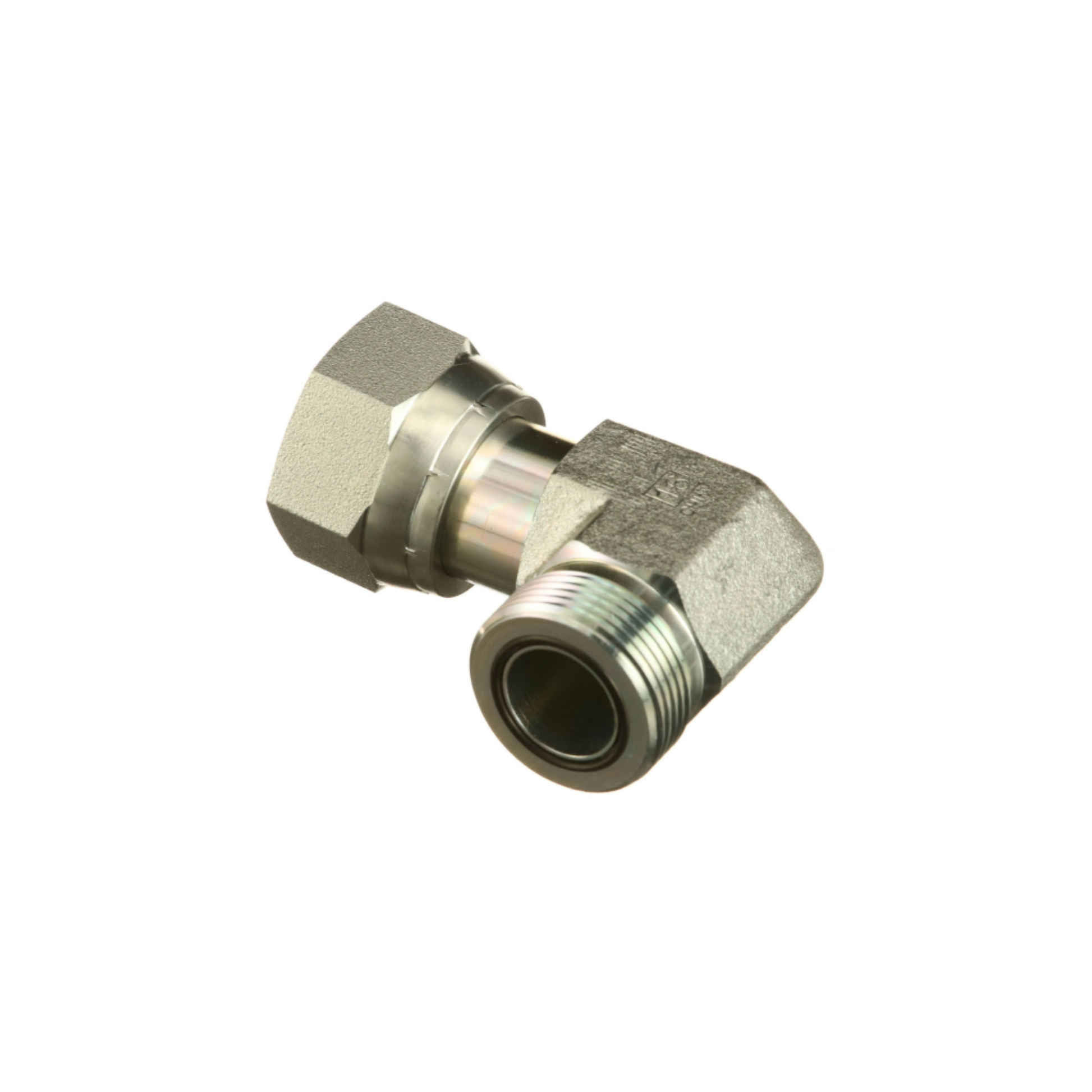 Ninety-degree hydraulic elbow fitting featuring 1 7/16''-12 ORFS male and 1 7/16''-12 female swivel connections. Designed to provide a secure, leak-free joint for hydraulic lines while allowing directional flexibility in tight installation spaces. Manufactured from high-strength, corrosion-resistant steel with precision-machined sealing surfaces to ensure long-lasting durability and reliable hydraulic performance under high-pressure operating conditions.